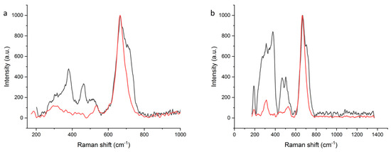Raman spectra of F1 (red line) and F2 (black line) obtained when excited with a wave of length 633 nm (a) and 785 nm (b).