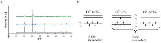 XRD patterns of F1 (blue), F2 (green), reference data code 01-089-3854 (grey) (a); Electronic configuration of iron ions in magnetite ([Fe3+]A[Fe2+Fe3+]BO4) (b).
