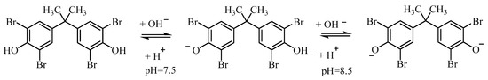 That means that the catalyst surface under the experimental conditions was negatively charged (≡Fe(II,III)O–). The ionic composition of the TBBPA solution depends on the pH of the solution as shown in Figure 4. Analysing the ionic composition of TBBPA under the reaction conditions, one can see that 87% of the compound is present as a dianion and 13% as a mono anionic compound. The negative charge on the catalyst surface repels negatively charged organic molecules, which reduces the rate of degradation.