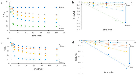 For all concentrations, good agreement with the first-order reaction can be observed. The effect of time and initial concentration on the efficiency of the photocatalytic degradation of TBBPA was investigated (Figure 5a,c). It can be seen that the substrates gradually disappear during photocatalysis. Simultaneously, with the disappearance of the substrate, bromide ions appear in the reaction mixture (Figure 6a,b). As the initial concentration of TBBPA decreases, the reaction rate increases (Figure 6c).