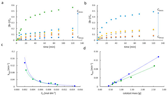 Bromide production in time for different TBBPA concentration on F1 (a) and F2 (b) catalyst; effect of TBBPA initial concentration on kapp for F1 (blue) and F2 (green) catalysts (c); apparent rate constant as function of catalyst loading F1—blue, F2—green (d); reductive conditions.
