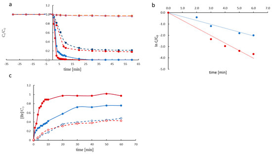 Comparison of TBBPA (0.002 mol dm−3) decay in time in reductive (dashed line, F1-blue, F2 red) and oxidative (continuous line, F1—blue, F2—red) processes on catalyst’s surface, control experiment without of light (dotted violet line—F1, dashed orange line—F2) (a); linear variation of ln(Ct/C0) versus time for the oxidative degradation of TBBPA (b); bromide production in time in oxidative process (filled circles) on F1 (blue) and F2 (red) and reductive process (empty circles, F1-blue, F2-red) (c).