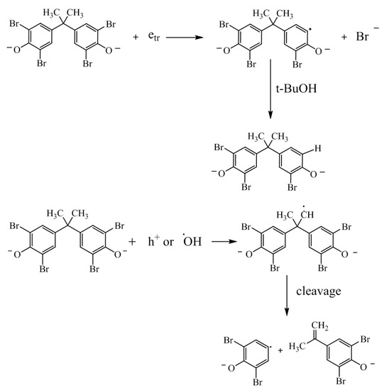 The irradiation of the catalyst causes band-gap excitation and generation of valence-band holes and conduction-band electrons. The presence of a hole scavenger (t-BuOH) causes an accumulation of electrons on the surface of the catalyst. The electrons can activate a carbon-halogen bond via DET (dissociative electron transfer) to produce a carbon-centered radical and halide anion. Transfer of the surface-trapped electron to the π* orbitals of TBBPA is the rate-limiting step [38]. It is followed by rapid intramolecular electron transfer to the anti-bonding σ* orbital of C-Br, producing aryl radical and bromide ion. It is preferable to cleave one bromide anion from one TBBPA molecule because compounds containing fewer halogen atoms are more resistant to reductive conversion (due to the increase in the electron density of the aryl ring with the decrease of halogen’s substituents number) [39].