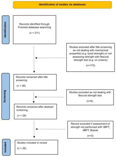 Publications were excluded if the assessment of strength did not refer to mechanical properties and the investigations did not perform flexural strength testing (3-Point Bending Test; 4-PBT or Biaxial Flexural Test).