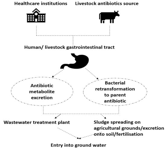 The widespread use of antibiotics contributes significantly to the resistance of bacteria to their bactericidal properties, which is a great challenge for modern medicine []. An excessive amount of prescribed antibiotics and their limited metabolism in human cells (30–90% of consumed antibiotics are not metabolized in the human body and are excreted into wastewater systems) leads to antibiotic exposure and accelerates resistance in bacteria []. The scheme of antibiotic distribution in the natural environment is presented in Figure 1.