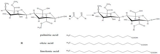 Fatty acids (FA) are organic compounds containing saturated or unsaturated aliphatic chains with a carboxylic group in their linear or branched structures. FAs are produced by algae and plants as an intrinsic protection against pathogens, including multi-drug-resistant bacteria. The antibacterial activity of FA is not well understood yet, but the in vitro tests prove that these compounds are as efficient as Gram-positive and Gram-negative bacteria biocidal agents []. Due to the antibacterial activity, fatty acids are often used as synthetic and natural polymer modifiers. The modification of biopolymers with fatty acids can be performed in the reaction of acylation in the presence of K2CO3 as a catalyst. An example of such a reaction can be the acetylation of pectin with oleic, linolenic and palmitic anhydrides, depicted in Figure 3.