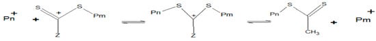 RAFT polymerization is very common in preparation of the APs due to the high versatility and robustness of this method []. The method was elaborated for the first time in the 1990s. Figure 4 presents the scheme of RAFT polymerization. The thiocarbonyls are one of the most often used active agents, which possesses an activating group (Z), modulating the addition and fragmentation rates and a radical leaving group (R), which must be able to efficiently reinitiate the polymerization process [].