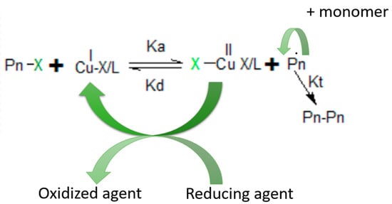 ATRP is also a method of controlled radical polymerization, but in comparison to RAFT polymerization, ATRP requires a transition metal catalyst, which is harmful to biological systems. The ATRP reaction has to be conducted in the inert atmosphere, which constitutes one of the major disadvantages of this process []. In Figure 5, the mechanism of ATRP polymerisation is presented.