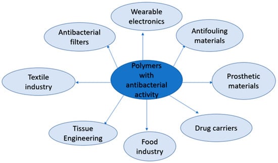 It is predicted that antibiotic-resistant bacteria can result in 10 million deaths by 2050 []. The issue of multidrug-resistant bacteria urged the need to elaborate the novel antipathogen agents []. The polymers and copolymers modified with bioactive compounds have emerged as a group of highly effective antimicrobial agents [] that find usage in many fields (Figure 6).