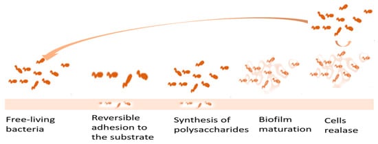 Bacterial infections, apart from mechanical damage, are one of the main causes of transplant failures. Polymeric biomaterials are often used as an antibacterial surface in regenerative medicine, and as the coating for medical implants that prevent bacterial biofilm generation. Bacterial biofilm formation is a defence mechanism against host immune cells, ensures chronicity of infection, and is initiated by a bacterial recognition known as quorum sensing. According to statistics, as much as 80% of clinical infections in humans are caused by biofilms. The presence of biofilm is often observed on the surface of orthopedic screws made of stainless steel and titanium. A mechanism of biofilm formation is presented in Figure 8. The first step is the bacteria;s adhesion to the surface. At a distance of about 50 nm from the implant surface, bacterial cells are attracted by Van der Waals forces. At a distance of 20 nm, between the bacteria and the implant, electrostatic repulsive forces occur depending on the interaction between the surface and the usually negatively charged bacteria. At 5 nm from the surface, the strongest Van der Waals and electrostatic forces, as well as hydrophobic and site-specific interactions, begin to occur. After adhesion to the surface, bacteria start to proliferate and grow, producing extracellular polymeric substances that help them capture nutrients and improve their survivability. Due to the cell–to–cell communication in biofilm, bacteria are able to adapt to environmental conditions and colonize new surfaces. After biofilm maturation, some of it dissipates, releasing floating bacteria that can redeposit on the surface [,,].