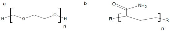 Among the polymeric materials that can be helpful in preventing biofilm formation are antifouling polymers, which repel the bacteria from the surface with chemical or physical mechanisms, and antibacterial ones, e.g., peptide mimetic polymers and cationic polymers []. Within the antifouling agents, the surfaces functionalised with hydrophilic, zwitterionic, and superhydrophobic polymers should be listed []. The feature of hydrophilic polymers is their favourable interaction with water, which provides them good solubility and swellability []. In transplantology, hydrophilic polymers are of great interest due to their ability to mimic the properties of natural cartilage []. Poly (ethylene glycol) (PEG) and poly (acrylamide) (PAM) (Figure 9) are popular representatives of such hydrophilic polymers [].