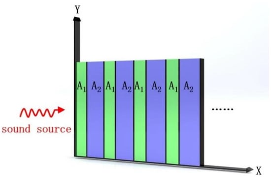 One-dimensional acoustic–phononic lattices consisting of repeating dual-material units can be modeled using the form of the wave equation for elastic wave propagation. A single lattice unit is constructed of laminated and materials. The acoustic transmission characteristics of the lattices, treated as a continuous mass media, can be derived from correlations of particle velocity and acoustic pressure. Figure 1 provides a conceptual illustration of the phonon lattice units alternating continuously in the -direction, with thicknesses and . The vibration-induced acoustic wave propagates along the -axis and satisfies the equilibrium condition shown in Equation (1) [46]:
