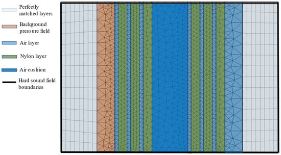 The FEA model emitted plane waves from the background pressure field (in red) toward the PSPC, at a pressure amplitude of 2 Pa. The mesh size was set to be smaller than or equal to based on the speed of sound () and the maximum frequency (), with a minimum cell size of 0.0054 cm. The PML had 8 units to fully absorb outgoing waves. With these settings, the simulation model could accurately study the interaction of the emitted plane waves with the PSPC.