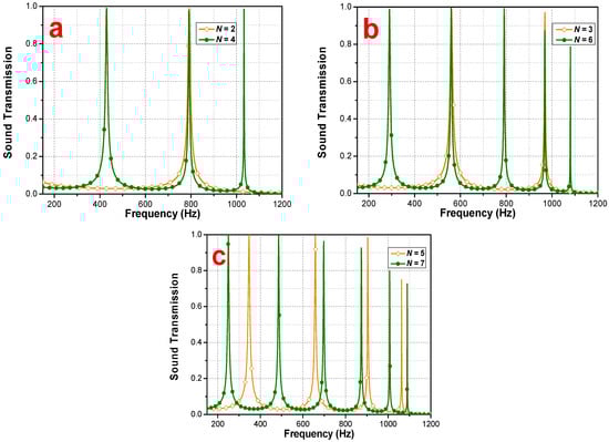 FEA-simulated results of sound transmission at period N = 2, 3, 4, 5, 6, and 7. (a) N = 2 vs. N = 4; (b) N = 3 vs. N = 6; (c) N = 5 vs. N = 7.