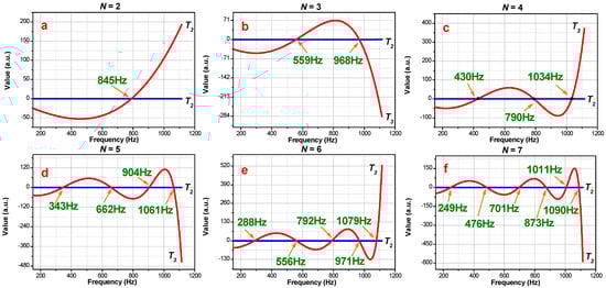 In Figure 6, this particular correlation of sub-matrices and period variations of PSPC-induced tunneling frequencies was studied. The intersection node numbers of and increase along with the PSPC period number, , rising up. The curves all follow the manner of oscillating before the last intersection node and of non-convergence in the rest portion. Comparing the theoretical and FEA simulation results, we see that the intersection nodes of and agree well with the tunneling frequencies where the sound can transmit through the whole PSPC meta-structure. The intersection frequency of and at meets the tunneling frequency at about 845 Hz. For , and intersect at 2 nodes that meet the tunneling frequency at approximately 559 Hz and 968 Hz; for , and intersect at 2 positions that agree with the tunneling frequencies at 430 Hz, 790 Hz, and 1034 Hz, respectively.