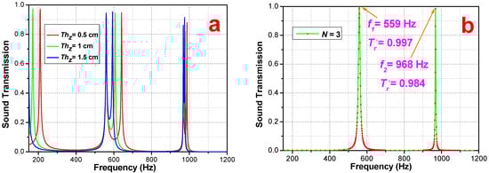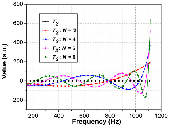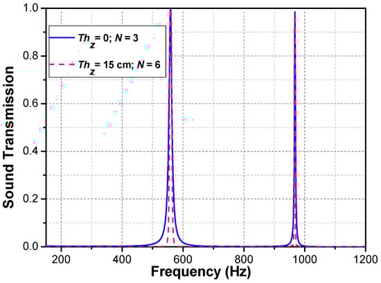 Regardless of the peak at 0 Hz, the relationship between the number of tunneling peaks () and the number of PSPC periods () is , which is also determined by the transmittance expression denominator in Equation (17). The second term of the denominator is two orders less than the first term, so the transmittance mainly relies on the first term; that is, when the first term comes to , the sound wave is supposed to transmit through PSPC with little attenuation, and the transmittance is close to 1. Therefore, it can be determined that the tunneling frequencies are firmly consistent with the intersection frequencies between and .