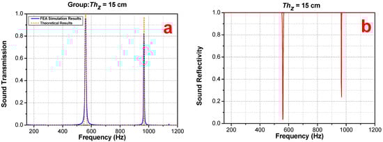 (a) Results of sound transmission at = 15 cm, N = 6; (b) results of sound reflectivity at = 15 cm, N = 6.