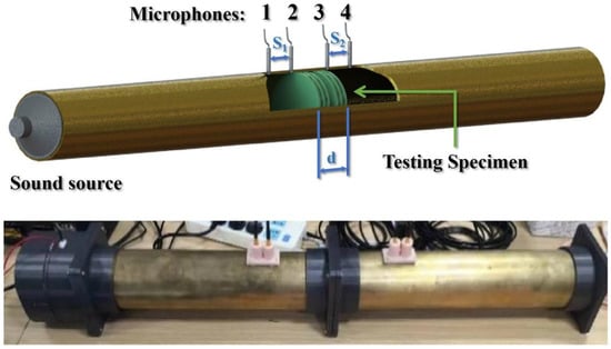 A uniform sound was swiped from 50 to 800 Hz by the speaker and was projected to the testing specimen in the coaxial direction. Four 1/8″ AWA14615 measurement microphones were flushed mounted on the inner surface of the tube, and the microphone diameter is less than 20% of the measured minimum wavelength. The maximum microphone spacing is less than 80% of the required minimum half-wavelength. Four microphone cables, a Victor VC2040H signal generator, and a SAST D5-200A power amplifier were connected to the ICON Upod Nano audio signal acquisition system, enabling real-time data collection.