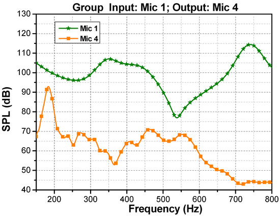 The sound transmission of the PSPC specimen, with up- and downstream periods of and = 2 cm, was experimentally measured by the impedance tube introduced in Section 4.1. Figure 14 illustrates the upstream and downstream sound-pressure level measured by Microphones 1 and 4, under 800 Hz, labeled as the input and output data.