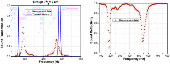 It can be observed that the differences between the input and output sound-pressure levels (SPLs) near 100 Hz to 200 Hz and 500 Hz to 600 Hz at the tunneling peaks do not exceed 10 dB, thus indicating high transmission. Calculation using Equations (19)–(25) shows that the measured transmission of the phononic crystal was primarily below 0.05 within 800 Hz, with exceptional tunneling transmissions of 0.56 at 189 Hz and 0.32 at 538 Hz. This result is in close agreement with the theoretical prediction from Equation (17), as clearly shown in Figure 15. As discussed previously, these two tunneling peaks distinctly demarcate a stopband from 189 Hz to 538 Hz that can be accurately predicted using the accessible geometric parameters and and the acoustic impedance properties of a single layer of hull material.