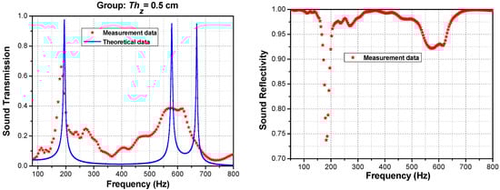 Theoretical and experimental sound transmissions and sound reflectivity at = 0.5 cm, N = 6.