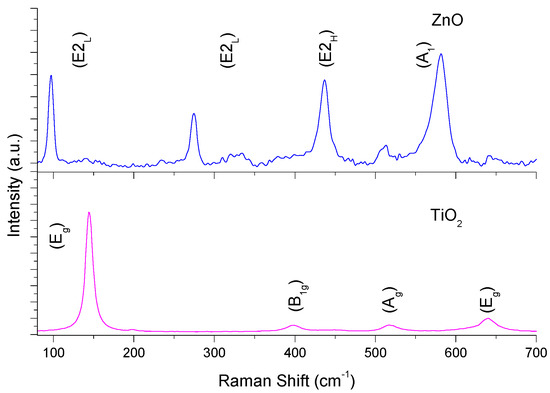 The Raman spectroscopy results are shown in Figure 1. Six Raman-active vibrational modes were observed for TiO2 in Raman spectroscopy (e.g., A1g + 2B1g + 3Eg) [37]. Three Raman-active vibrational modes were observed for ZnO in Raman spectroscopy (e.g., A1 + E1 + E2) [38]. Both catalysts shows the typical signals reported for such materials [39,40]. For the case of ZnO, the signals located at 274.5 cm−1 can be associated with oxygen vacancies into the semiconductor lattice [41,42].