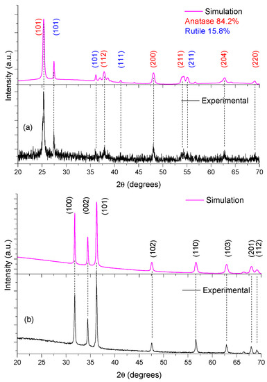 We utilized a PowderCell package to simulate the experimental XRD data. In the simulation, we employed the rutile and anatase forms of TiO2, and hexagonal wurtzite (ZnO) crystalline structures. We applied the Rietveld method (Bragg–Brentano geometry with the March–Dollase as model to preferred orientation; with the plane the plane (101) as plane’s orientation. The X-ray source was Cu radiation ( = 0.1544426 nm); the pseudo-Voigt 1 function iterations 300; and the φ factor was 1.9. This methodology was suitable to identify the crystalline phases in each thin film. Table 1 lists the crystalline parameters obtained from the simulations. We employed the Debye–Scherrer equation to determine grain size of the semiconductors [45]. The domain grain size of ZnO was 34.4 nm, and 24.1 nm and 38.8 nm for anatase and rutile structures, respectively. These results correspond to those of previous reports by other authors [44,46].