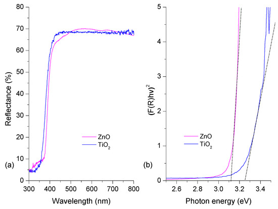 (a) TiO2 and ZnO thin films’ diffuse reflectance spectra; (b) Kubelka–Munk plots.