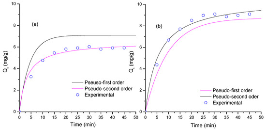 where qt is the amount of MB adsorbed per unit mass of the adsorbent (mg·g−1) at each time; qe is the maximum sorption capacity (mg ·g−1); and k1 (min−1) and k2 (g·mg−1·min−1) are the rate constants of the pseudo-first- and pseudo-second-order models, respectively. The fitting correlation coefficient (R2) was used to determine the best-fitting kinetic models. Finally, we calculated standard enthalpy (ΔH°), standard entropy (ΔS°), and standard Gibbs free energy (ΔG°) for the adsorption process applying the Arrhenius equation [36]: