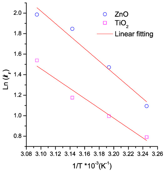 Figure 6 shows the thermodynamic calculation applying the Arrhenius equation to MB adsorption onto the thin films of both semiconductors (Equation (6)). The ΔH° and ΔS° values were calculated from Figure 6. Table 3 lists the thermodynamic results. The removal of MB by using semiconductor oxides was a spontaneous process (ΔG < 0, for both materials). This result is due to the morphological properties of the semiconductors’ surface. Furthermore, the adsorption process was endothermic and more stable for TiO2 than for ZnO. The positive ΔS values of both semiconductor oxides could be associated with a degree of hydration of cationic MB molecules in the solution [64]. The MB remotion was more favored on TiO2 than on ZnO. Table 3 lists the thermodynamic results reported by other authors. Results show a variation range depending on both adsorbent and dye type. The ΔG° values for all studies listed in Table 3 are negative. It indicates that the dye adsorption onto adsorbents was spontaneous. This spontaneity of the process increases when the temperature increases. Bennabi et. al. reported that this behavior is associated with decreasing thickness of the boundary layer surrounding the adsorbent surface with temperature increasing. This effect improves the mass transfer of the dye to the adsorbent surface [65].