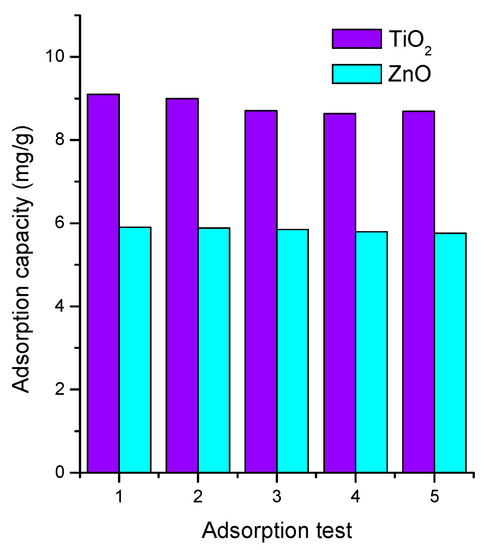 To verify the potential application of semiconductors in continuous remediation water systems, we determined the recyclability of both semiconductor oxides in the MB adsorption during various cycles. Figure 7 shows the stability results of the studied semiconductors. The adsorption process was repeated five consecutive times. Figure 7 shows that after the fifth cycle, the removal performance reduced by 5% for TiO2 and 2% for ZnO. Such stable results are associated with the stability of the semiconductor oxides, and with the chemistry of the substrate (soda lime glass) and method of thin film deposition. These results indicate that the thin films were suitable and reusable for MB adsorption after five cycles.