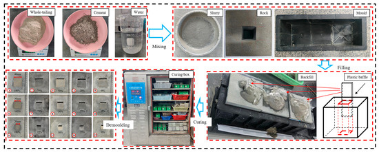 To prepare the GSR with different RCFR conditions, plastic baffles were inserted into the goaf to control the RCFR. The prepared filling slurry has a cement-sand ratio of 1:6 and a solid mass concentration of 75%. The prepared GSR was placed in a curing box with a humidity of ≥90% and a temperature of 20° ± 2. The GSR demould after 2 days of curing, and then placed in the curing box for 26 days of curing for a total of 28 days. Finally, the biaxial loading experiment was carried out. The preparation process of the GSR is shown in Figure 1.