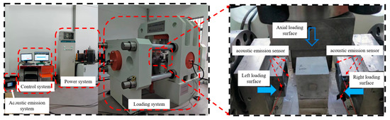 This experiment was completed on the rock true triaxial dynamic and static load experimental system. The experimental steps are as follows: The GSR was placed on a fixed loading platform, and three acoustic emission sensors were added to the left and right surfaces. The sampling threshold of the acoustic emission test and analysis system was set to be 40 dB and the sampling frequency was 40 MHz. The left and right loading surfaces were set to 30 MPa confining pressure, and the axial loading surface was loaded at 0.002 mm/s until the sample was completely destroyed. The front and rear were free surfaces and were not loaded. The experiment systems are shown in Figure 2.