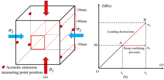 The loading mode of the GSR in the biaxial loading experiment is shown in Figure 3a. Among them, the upper and lower sides were used as the loading surface, and three acoustic emission monitoring points were distributed on the left and right sides. The loading path of the experiment is shown in Figure 3b. Firstly, the σ1 and σ2 of the GSR were loaded to the predetermined pressure state (OA) at a loading rate of 0.2 MPa/s. At this time, σ1 = σ2 = 30 MPa, and then keep σ2 unchanged, controls the axial wall to maintain the rate of 0.002 mm/s to axially load the GSR until the axial stress of the model exceeds the ultimate bearing capacity at this time, and finally loses stability.