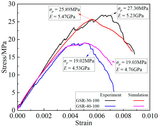 The stress-strain curve can express well the failure characteristics of the GSR during loading. Figure 7 shows the stress-strain curves and failure models of the GSR under different working conditions (this manuscript lists some GSR for analysis). By observing the stress-strain curve of the specimen during the biaxial loading compression experiment, the curve is divided into four stages.
