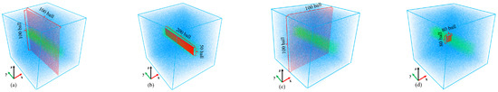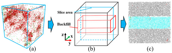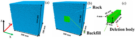 The size of the GSR is 100 mm × 100 mm × 100 mm, so the pure rock model of 100 mm × 100 mm × 100 mm was constructed first, as shown in Figure 5a. According to the requirement of the aperture size, the middle part of the area was removed to generate the backfill in the area, as shown in Figure 5b. According to the different RCFR, a small part of the backfill was deleted, as shown in Figure 5c, and a small block of 50 mm × 20 mm × 4 mm was deleted to achieve a 50% RCFR effect. In this way, 25 models composed of five kinds of goaf sizes and five kinds of RCFR were established, and the number of particles per type was more than 200,000.