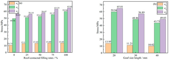 Stress histogram at each stage (a) The relationship between roof-contacted filling rate and strength; (b) The relationship between goaf size and strength.