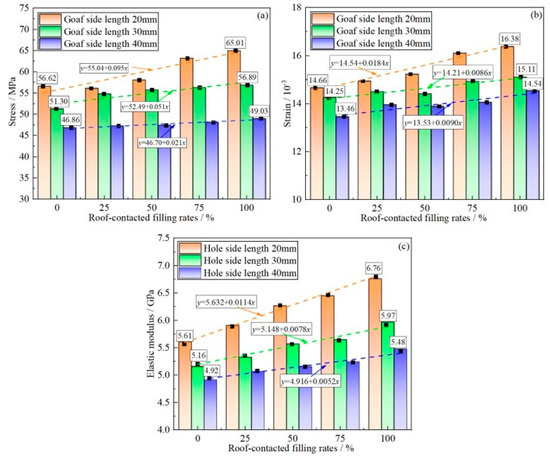 As can be seen from Figure 9c, the elastic modulus of the GSR increases with the increase of the RCFR, and shows a good linear relationship, as shown in Table 3, when the RCFR increases from 0% to 100%. The elastic modulus of the GSR increases from 5.61 GPa to 6.76 GPa when the goaf size is 20 mm, and the growth rate is 20.5%. When the goaf size is 30 mm, the elastic modulus of the GSR increases from 5.16 GPa to 5.97 GPa, with a growth rate of 15.7%. When the goaf size is 40 mm, the elastic modulus of the GSR increases from 4.92 GPa to 5.48 GPa, with a growth rate of 11.4%. It can be found that the increase of the goaf makes the growth rate of the RCFR decrease the elastic modulus of the GSR.