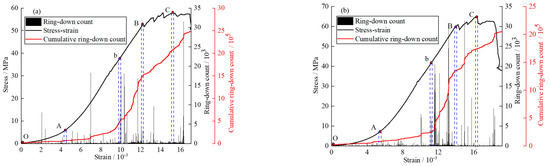 In the compaction stage (OA) and the no crack developed stage (Ab), the number of acoustic emission ringing count signals is small, most are less than 5000 times, and the cumulative acoustic emission ringing count is at a low level. In the crack developed stage (bB), the number of acoustic emission ringing count signals increases rapidly, and multiple acoustic emission ringing count peaks appear. The cumulative acoustic emission ringing count increases sharply; in Figure 10a, more than 15,000 times, and in Figure 10b, more than 20,000 times. In the yield stage (BC), the number of acoustic emissions ringing count signals is reduced compared with the bB stage, but there are still individual acoustic emission ringing count peaks, and the cumulative acoustic emission ringing count shows a “stepwise” growth. In the post-failure stage (CD), the number of acoustic emissions ringing count signals is greatly reduced, and the cumulative acoustic emission ringing count becomes a slow growth.