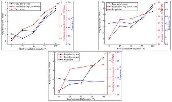 Quantitative analysis was conducted on the variation characteristics of acoustic emission ringing numbers with filling and capping rates at stage points A, B, and C. The average number of ringing numbers in the extremely small monitoring area before and after each stage point was taken, and a relationship diagram between acoustic emission ringing numbers and filling and capping rates was drawn based on the processed data, as shown in Figure 11. In the initial stage of loading, with the increase of the RCFR, the number of acoustic emission ring-down counts increased from 2 to 7 times, the cumulative acoustic emission ring-down counts increased from 58,000 to 87,000, and the total proportion of cumulative acoustic emission ring-down counts increased from 2.84% to 3.40%. It can be seen from Figure 11b that in the middle and late stages of loading, with the increase of the RCFR, the acoustic emission ring-down counts increased from 8 to 18 times, and the cumulative acoustic emission ring-down counts increased from 1.28 million to 1.67 million. The total proportion of cumulative acoustic emission ring-down counts increased from 60.2% to 65.3%. From Figure 11c, it can be seen that in the later stage of loading, with the increase of the RCFR, the acoustic emission ring-down counts increased from 4 times to 11 times, the cumulative acoustic emission ring-down counts increased from 1.53 million to 1.86 million, but the total proportion of cumulative acoustic emission ring-down counts reduced from 74.6% to 68.7%.