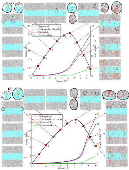 As can be seen from Figure 13a, in the initial stage of loading (0–3), the internal stress of the GSR sample rarely exceeds the cohesion between the particles, and almost no cracks are produced. In the medium term of loading (3–6), cracks begin to appear in the GSR sample. The goaf is compressed, and the backfill in the roof-contacted part undergoes downward displacement under the pressure of the surrounding rock, while the backfill in the non roof-contacted part does not bear the pressure of the surrounding rock and does not undergo displacement. Therefore, shear cracks are prone to occur at the connection (marked in red). Under the compression of the rock mass, the end particles of the backfill soil are squeezed out, causing outward displacement, and tensile cracks (marked in green) are generated in the backfill. In the later stage of loading (6–9), the internal crack growth rate of the GSR sample rises sharply, and cracks are initiated at the left and right positions of the rock mass (red mark), and extend to the goaf position.