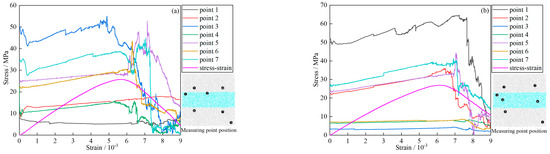 As can be seen from Figure 14a, the peak stress of GSR-30-50 is 25.76 MPa. Before the peak stress of the GSR, the stress-strain curves of the measuring points are relatively gentle and maintain an upward trend with small fluctuations. When the GSR reaches the peak stress position, the whole sample tends to be in a state of instability and failure, and the stress at each point inside is continuously released, resulting up-and-down fluctuations in the stress-strain curve of the measuring point. At measuring points 3 and 5 inside the rock mass, the corresponding peak stress reaches 55.2 MPa and 52.9 MPa, which is more than twice the peak stress, indicating that stress concentration occurs at the measuring point. The peak stress of 6 and 7 reaches 43.4 MPa and 44.7 MPa, which is higher than the peak stress of the GSR. It shows that the stress concentration also occurs at the measuring point. However, compared with the stress concentration phenomenon at positions 3 and 5, the stress concentration phenomenon is weaker. The peak stress of measuring points 1 and 2 inside the backfill is 6.8 MPa and 18.0 MPa, which is lower than the peak stress of the GSR.
