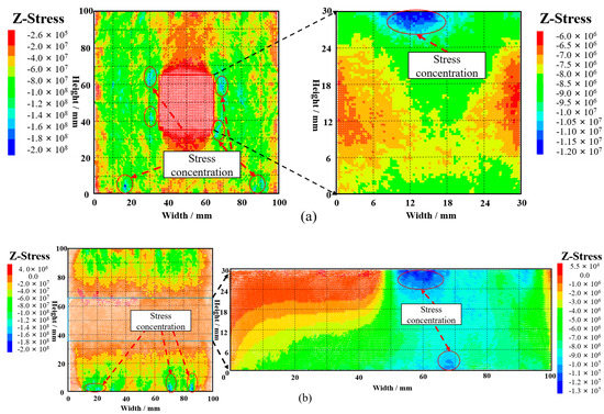 Figure 16a shows the xz plane of the GSR-30-100 composite model. The phenomenon of stress concentration occurs at the left and right positions at the bottom of the rock mass and at the top and bottom of the backfill. Figure 16b shows the yz plane of the GSR-30-100 composite model. The stress concentration of the rock mass mainly occurs at the left and right positions at the bottom of the rock mass, The stress concentration of the backfill occurs in several areas at the top and bottom. Therefore, in the process of mining filling, it is necessary to improve the filling quality and ensure a high RCFR in order to improve the support effect of the backfill on the surrounding rock and ensure the safety and stability of the mining site.