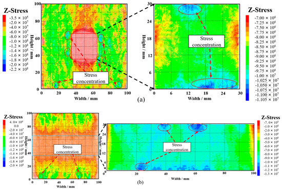 In PFC numerical simulation, the basic principles of “negative pressure and positive tension” forces are followed. The stress in the following stress nephogram is negative. The greater the negative value, the greater the pressure. This is not only consistent with the compression state of GSR, but also determines the location of the main stress concentration generated. The stress in the rock mass and backfill in GSR is studied and analyzed separately.