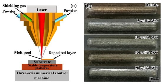 The bainite steel matrix composites were manufactured using a laser processing system (as shown in Figure 1) comprising a semiconductor laser device with a maximum output power of 2.5 kW (LDM-2500-60, Laserline, Mülheim-Kärlich, Germany), a three-axis numerical control machine controlling the laser scanning path, a powder coaxial nozzle feeding system with a shielding gas device and a stable temperature platform. The process involved the following 3 steps. Firstly, the substrates were heated to 300 ± 5 °C in the resistance furnace using argon protection and then placed on a platform with the pre-set heated temperature of 300 °C to avoid martensite transformation during laser deposition. Afterwards, the composite powder was deposited on the surface of the substrates using DLD technology. The processing parameters were as follows: laser power of 800 W, laser spot diameter of 1.5 ± 0.1 mm, overlap ratio of 40% and scanning velocity of 360 mm/min. As shown in Figure 1b, the samples had a good surface quality and no macroscopic cracks were observed. Finally, the composite samples were put into a 300 ± 3 °C salt bath for isothermal treatment for 200 min, and the final composites, air cooled to room temperature (RT), were obtained. Specimens were sectioned using electric discharge wire cutting to obtain the composite samples and characterize their microstructure and mechanical properties.