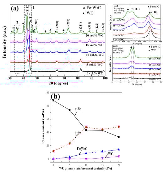 Figure 2 illustrates the phase constituents and their relative contents in the bainite steel matrix composite. As shown in Figure 2a, the matrix of the composite is changed from a mainly ferrite phase (α-Fe) with a little austenite phase (γ-Fe) to α-Fe with a considerable amount of γ-Fe when WC primary reinforcements are added. Furthermore, a Fe3W3C phase appears instead of a WC phase when the addition of primary reinforcement is relatively low. The WC phase presents together with the Fe3W3C phase when the primary reinforcement exceeds 15 vol%. The volume fraction of different phases was further quantified, as shown in Figure 2b. In the case of peak overlapping (the magnified images in Figure 2a), a Pearson VII function was used for the peak separation and fitting [15,40,41,42]. As the volume fraction of the WC primary reinforcement is increased, the volume fraction of the α-Fe phase declines; however, that of the γ-Fe phase increases. The volume fraction of the γ-Fe phase is not higher than that of the α-Fe phase until the WC primary reinforcement content reaches 20 vol%. As for the carbides, the volume fraction of Fe3W3C increases approximately linearly with the increased primary reinforcement content, and its maximum value is about 14 vol%. However, with the increased WC primary reinforcement content, the final WC content of the composites is maintained at zero when the content is less than 10%; meanwhile, when the content of primary reinforcement is higher than 10 vol%, the volume fraction of the final WC rises. When the content of primary reinforcement is 20%, the final WC reinforcement content in the composites is 4.1 vol%.