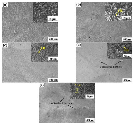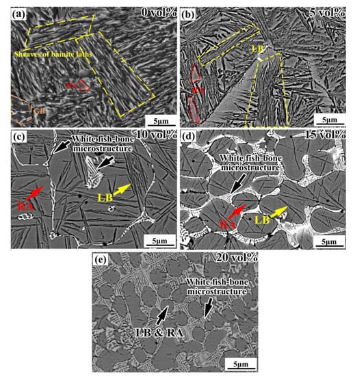 The fine microstructure of the bainite steel matrix composites was further investigated using the BSE mode of SEM, as shown in Figure 4. As for the bainite steel with no WC addition (Figure 4a), the bainite steel mainly consists of sheaves of lath-like bainite, a few granular bainite (GB) and island-like RA. With the increased WC reinforcement volume fraction, the lath-like bainite and GB transform into black needle-like lower bainite (LB), and the length and width of the LB needles decrease gradually (Figure 4b–e). Meanwhile, the morphology of RA also changes from an island-like to block-like shape. For the bainite steel matrix composite with a relatively high volume fraction of WC (no less than 10 vol%), the white fish-bone-shaped microstructure appears at the boundary of the prior austenite grains (Figure 4d,e). With the increased addition of WC, the area of the intergranular region occupied by the white fish-bone-shaped microstructure increases; at the same time, the prior austenite grain is refined.