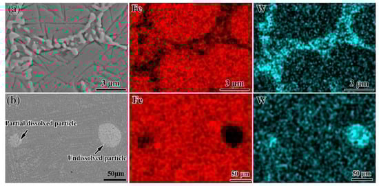 According to the phase constituent and the microstructure of the bainite steel matrix composite with 15 vol% WC particles, EDS analysis was conducted to further identify the phase composition of the intergranular region and undissolved particles. As shown in Figure 5a, the elemental maps of the intergranular region indicate that W enriches the white fish-bone-shaped microstructure. Combining the volume fraction of the white fish-bone-shaped microstructure obtained from the SEM images with the phase analysis results from the XRD patterns, the white fish-bone-shaped phase is Fe3W3C. The elemental distributions of the partial dissolved particles and the undissolved particles are presented in Figure 5b. Much W and little Fe can be detected in the partially dissolved WC particles region. Meanwhile, in the undissolved WC particles region, the enrichment degree of W in the interior of the particles is much higher than that of the partially dissolved particles, and no Fe is detected.