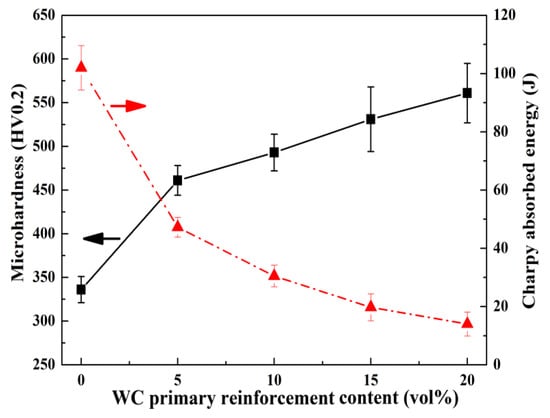 As shown in Figure 6, the microhardness of the bainite steel is about 330 HV0.2, which is lower than that of the U75V steel substrate (375 HV0.2). The microhardness of the DLD manufactured bainite steel matrix composites is much higher than that of the U75V steel substrate. With the increased primary reinforcement content, the microhardness of bainite steel matrix composites increases remarkably. The microhardness increases rapidly to 461 HV0.2 when the WC primary reinforcement volume fraction is only 5 vol%, which is approximately 40% higher than that of the bainite steel. Moreover, the microhardness of composites with 20 vol% primary reinforcement is increased to 561 HV0.2. In contrast, the impact toughness of the bainite steel matrix composite decreases with the increased volume fraction of WC primary reinforcement (Figure 6). However, the impact toughness of the composite when the primary reinforcement volume fraction is less than 10% is still higher than that of the U75V steel substrate (26 J), which can satisfy the demand of the rail turnout service.