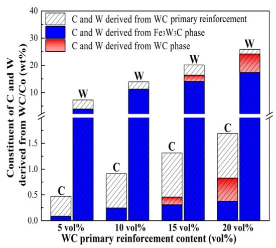 With the increased volume fraction of WC primary reinforcement, not only the constituent and morphology of the final reinforcement in the composites are changed, but also the microstructure of the bainite steel matrix is significantly altered (Figure 3 and Figure 4), which is attributed to the change in the solute W and C content in the bainite steel matrix. Figure 9 presents the constituent of C and W derived from the WC primary reinforcement. It can be concluded that the formation of the Fe3W3C phase and WC phase does not consume all the C and W derived from the WC primary reinforcement and the remaining C and W dissolve in the bainite steel matrix, which significantly retards the transformation of undercooled austenite [50,51].